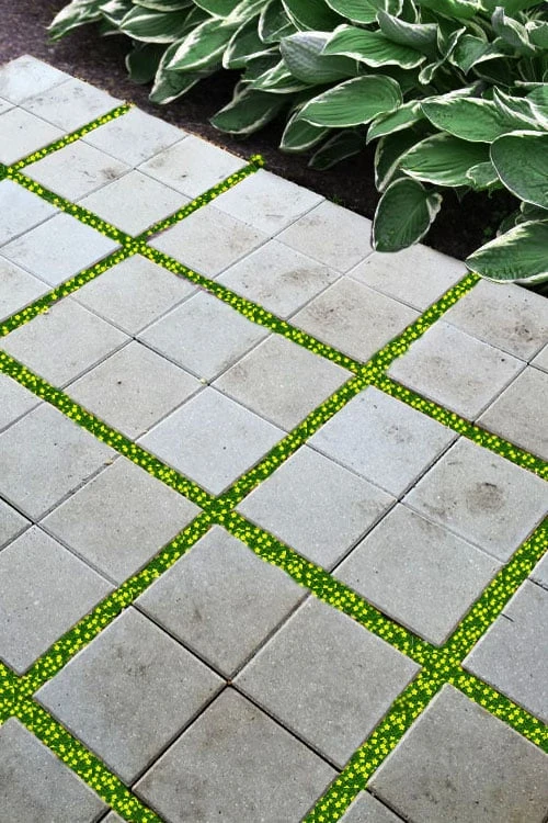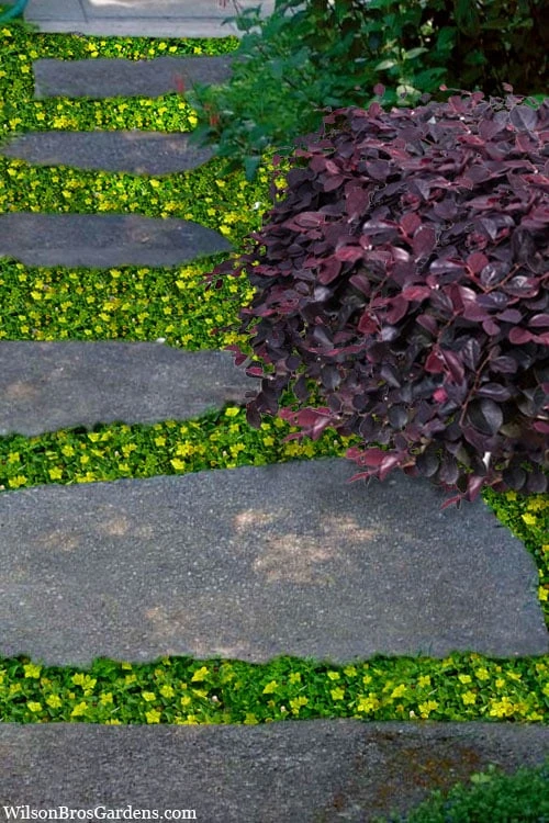 Having now had experience since 2014 in our gardens with Lysimachia japonica var. minutissima since 2014, we are ready to declare that what we commonly call Yellow Star Creeper and others might call dwarf creeping jenny or miniature moneywort, is one of if not the overall best choices among creeping plants for use in filling the gaps, crevices and spaces between stepping stones and pavers. It will fill any size space, but where it really excels among other choices is in those narrow inch-wide gaps between brick pavers, where it neatly fills the gaps without quickly growing all over the top of the pavers, which means no need for routine edging to keep plants in bounds.Â